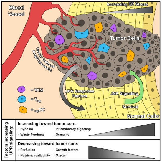 UPR signaling in a tumor and the surrounding microenvironment. The composition of the tumor and its microenvironment promote UPR signaling in cancer cells via various mechanisms. Poor perfusion, low oxygen, and reduced growth factor availability contribute to increased UPR signaling. The ability of cancer cells to exert ‘transmissible UPR signaling’ to the surrounding normal tissue has been associated with increased survival via JNK signaling. TAM, tumor associated macrophage; Treg, regulatory T-cell; regDC, regulatory dendritic cell; JNK, c-Jun N-terminal kinase.