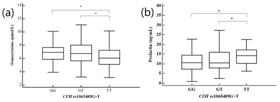 Association between (a) homocysteine and (b) prolactin levels and the CFH rs1065489G>T polymorphisms in patients with RPL. * p < 0.05.