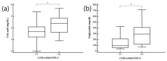 Association between (a) uric acid and (b) triglyceride levels and the CFH rs1061170T>C polymorphisms in patients with RPL. * p < 0.05.