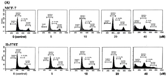 Diosgenin treatment inhibits the proliferation of various human solid tumors [17,20,21,22,23]. In the current study, the cell cycle distribution of diosgenin-treated breast cancer cell lines was determined. As shown in Figure 2A, diosgenin induced concentration-dependent increases in the percentages of MCF-7 and Hs578T cells in the G2/M and subG1 phases using propidium iodide staining of the DNA content and flow cytometric analysis. Diosgenin (10 µM for 48 h) caused a significant proportion of breast cancer cells to enter the G2/M phase. In addition, there was a significant increase in cells in the sub-G1 phase at the same concentration and time of diosgenin treatment (p < 0.05) (Figure 2B).