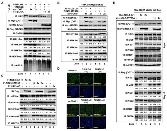 O-GlcNAc modification at NSL3 Thr755 site was required for maintaining the integrity of NSL complex and its holoenzyme activity. “+, −” in figures caption means with or without. (A) OGT1/O-GlcNAcylation mediated changes in global histone H4 acetylation and H3K4me2: increasing amounts of OGT1 or OGA were co-transfected with NSL3 into 293T cells in the presence of UBE2S and HA-ubiquitin. Global histone H4 acetylation at lysine K5, K8, and K16 and H3K4me2 levels was detected with corresponding antibodies. Ubiquitin-mediated NSL3 degradation was visualized with anti-HA antibody. (B–C) Effects of NSL3T755 site O-GlcNAcylation on holoenzyme activity: increasing amounts of OGT1 were co-transfected with NSL3wt or NSL3T755A into 293T cells in the presence of UBE2S and HA-ubiquitin. Modified histones were visualized by WB with specific acetylated or methylated antibodies (B). Further verification experiments were performed by transient transfecting Flag-tagged NSL3-3wt, NSL3-3T755A, and NSL3-dC plasmids. Global histone modification changes were measured with specific acetylated or methylated antibodies (C). (D) Cells were transfected with NSL3-3wt and NSL3-3 deletion (NSL3-dC) mutants. Forty-eight hours after transfection, immunofluorescence staining was carried out to detect the global histone H4K16ac status. (E) Effects of NSL3 Thr755 site O-GlcNAcylation on the integrity of NSL complex: the stably overexpressing Flag-OGT1 cells were transfected with gradient doses of NSL3-3wt and NSL3-3 T755A; Anti-Flag- agarose eluates were subjected to SDS-PAGE, and the interaction were detected by WB with indicated antibodies. The numbers in A, B, C, and E reveal the quantified protein levels by ImageJ. Normalization was done by dividing the target signal to GAPDH signal.