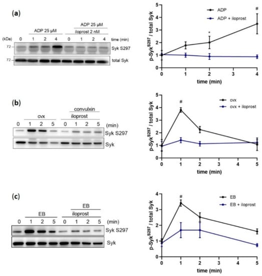 2.1. ADP, Convulxin, and Echicetin Beads Upregulate Syk S297 Phosphorylation, Which Is Inhibited by Iloprost