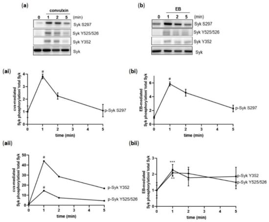 To better understand a possible link between the phosphorylation of S297 and Syk activation, we studied simultaneously the phosphorylation of Syk on S297, on Y525/526 (a Syk activation marker), and on Syk Y352 (important for Syk activity enhancement and for binding other proteins). Syk S297 showed a transient phosphorylation, which increased within 1 min of stimulation and then decreased both with convulxin (Figure 2a,ai) and EB (Figure 2b,bi) stimulation. A very similar transient time course was observed with Syk Y525/526 and Y352 phosphorylation in response to cvx (Figure 2a,aii) and EB (Figure 2b,bii). In contrast, ADP did not induce Syk Y525/526 or Y352 phosphorylation [26]. The observed Syk phosphorylation declined after initial stimulation, suggesting that a protein phosphatase is active.