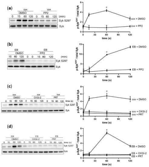 Cvx-and EB-mediated Syk S297 upregulation is dependent on SFKs and Syk activation. Washed human platelets were pre-incubated with vehicle control (DMSO) or with the SFK inhibitor PP2 (10 µM) for 5 min at 37 °C prior to stimulation, under stirring conditions with (a) 50 ng/mL cvx or (b) 0.5% (v/v) EB or with two different Syk inhibitors, OXSI-2 (2 µM) and PRT-060318 (1 µM) for 5 min at 37 °C prior to stimulation with (c) cvx or (d) EB. Phosphorylation of Syk S297 was analyzed by immunoblotting compared to total Syk. Data are represented as means ± SD from three independent experiments with platelets from three healthy donors. # p < 0.0001, DMSO versus inhibitor-treated (PP2, OXSI-2, or PRT-060318) platelets at 1 min in response to cvx or EB.