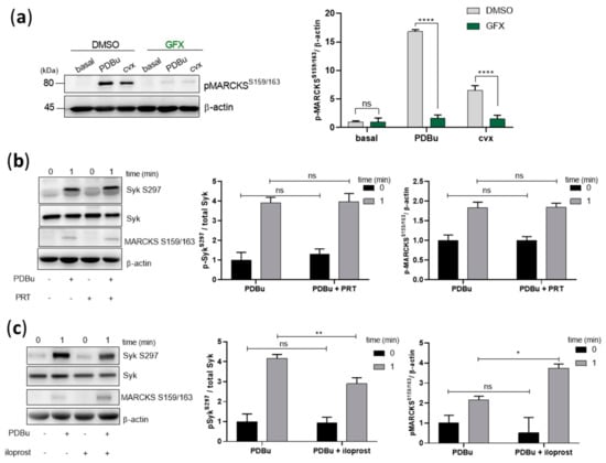 We then investigated the role of Syk kinase activity on the phosphorylation of S297 mediated by PKC activation. Firstly, we validated the effects of PDBu and GFX by analyzing myristoylated alanine-rich C-kinase substrate (MARCKS) phosphorylation, a well-established PKC substrate, also in platelets [34,35]. MARCKS was significantly phosphorylated on S159/163 in response to PDBu and convulxin, which was completely abolished by GFX (Figure 6a). Secondly, Syk inhibition by PRT-060318 did not affect PDBu-induced Syk S297 or MARCKS phosphorylation (Figure 6b), showing that PDBu-caused PKC activation does not require Syk, in contrast to S297 phosphorylation caused by cvx and EB (Figure 3c,d). Thirdly, PDBu/PKC-induced Syk S297 phosphorylation was only partially inhibited by iloprost, and PDBu/PKC-induced MARCKS phosphorylation was even increased by iloprost (Figure 6c). These data suggest that PKC per se was not inhibited by iloprost in intact platelets, but iloprost (PKA) inhibited signaling pathways upstream of PKC activation.