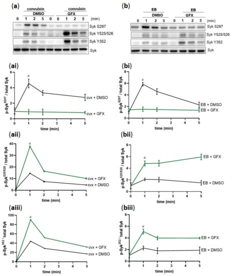 Syk phosphorylation is differentially regulated by PKC. Washed human platelets were pre-incubated with DMSO (vehicle control) or with pan-PKC inhibitor GF109203X (5 µM) at 37 °C for 5 min prior to stimulation with (a) 50 ng/mL cvx or (b) 0.5% (v/v) EB. Platelet aggregation was stopped by adding Laemmli buffer after 1, 2, or 5 min of stimulation under stirring conditions. The kinetics of the phosphorylation of Syk on (ai,bi) S297, (aii,bii) Y525/526, and (aiii,biii) Y352 compared to total Syk are represented as means ± SD from three independent experiments with platelets from three healthy donors. # p < 0.0001, DMSO-versus GFX-treated platelets at 1 min in response to cvx or EB.