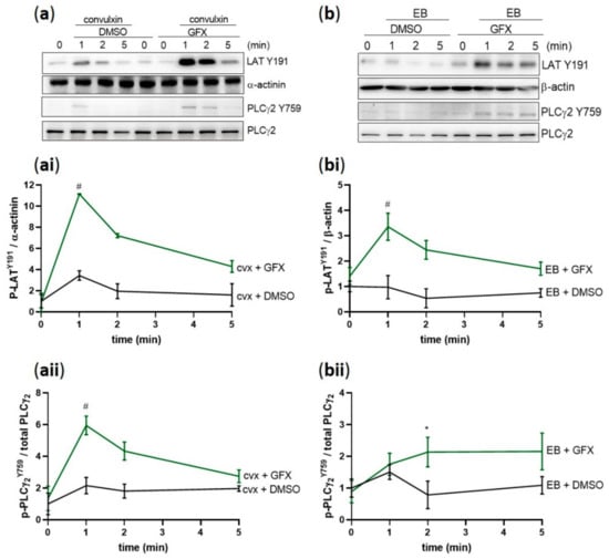 PKC inhibition induces hyperphosphorylation of Y-sites of Syk substrates. Washed human platelets were pre-incubated with DMSO (vehicle control) or with pan-PKC inhibitor GF109203X (5 µM) at 37 °C for 5 min prior to stimulation with (a) 50 ng/mL cvx or (b) 0.5% (v/v) EB. Platelet aggregation was stopped by adding Laemmli buffer after 1, 2, or 5 min of stimulation under stirring conditions. The kinetics of the phosphorylation of (ai,bi) LAT on Y191 and (aii,bii) PLCγ2 on Y759 compared to the adequate loading control are represented as means ± SD from three independent experiments with platelets from three healthy donors. # p < 0.0001, * p < 0.05, DMSO-versus GFX-treated platelets at 1 min or 2 min in response to cvx or EB, respectively.