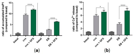 Furthermore, we aimed to measure the activity of PLCγ2 by monitoring intracellular inositol triphosphate (InsP3) production (via inositol monophosphate (InsP1) accumulation) and intracellular Ca2+ mobilization. In the presence of GFX, cvx-and EB-evoked InsP3 production was significantly enhanced compared to the control in the absence of the PKC inhibitor (Figure 9a). Moreover, this InsP3 production, mediated by cvx and EB, led to a significant increase of intracellular Ca2+ mobilization, which was even more pronounced in the presence of GFX (Figure 9b). These data show that Syk hyperphosphorylation is followed by an increase in LAT/PLCγ2 phosphorylation leading to an increase of InsP3 production and subsequent Ca2+ mobilization.