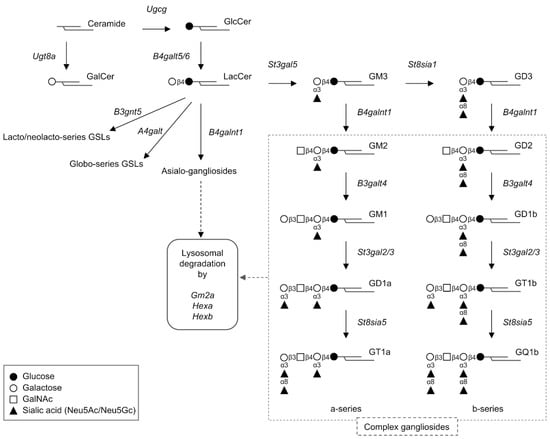 - Kolter, T.; Proia, R.L.; Sandhoff, K. Combinatorial ganglioside biosynthesis. J. Biol. Chem. 2002, 277, 25859–25862. [Google Scholar] [CrossRef]