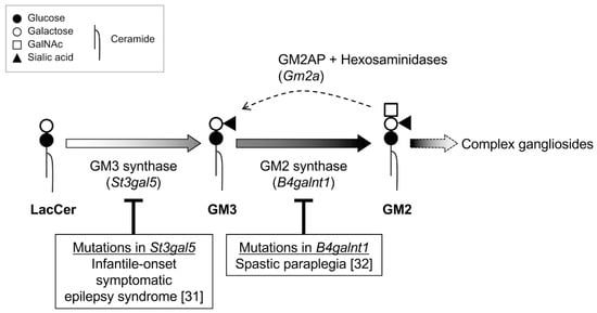 - Simpson, M.A.; Cross, H.; Proukakis, C.; Priestman, D.A.; Neville, D.C.; Reinkensmeier, G.; Wang, H.; Wiznitzer, M.; Gurtz, K.; Verganelaki, A.; et al. Infantile-onset symptomatic epilepsy syndrome caused by a homozygous loss-of-function mutation of GM3 synthase. Nat. Genet. 2004, 36, 1225–1229. [Google Scholar] [CrossRef] [PubMed]
