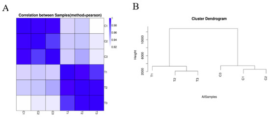 Sample quality test. (A) Heatmap of Pearson correlation between samples. The x- and y-axes represent each sample. (B) Hierarchical clustering between all and samples. C1, untreated hairy roots group number 1; C2, untreated hairy roots group number 2; C3, untreated hairy roots group number 3; T1, hairy roots treated with 200 μM Cd for 1 d, group number 1; T2, hairy roots treated with 200 μM Cd for 1 d, group number 2; T3, hairy roots treated with 200 μM Cd for 1 d, group number 3.