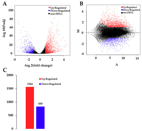 Analysis of differentially expressed genes (DEGs) between control and treatment groups. (A) Volcano plot of DEGs. The x-axis represents the log2-transformed fold change. The y-axis represents the -log10-transformed significance. (B) Minus-versus-add (MA) plot of DEGs. The x-axis represents value A (log2-transformed mean expression level). The y-axis represents value M (log2-transformed fold change). Red points represent up regulated DEGs. Blue points represent down regulated DEGs. Black points represent non-DEGs. (C) Summary of DEGs. The x-axis represents the compared samples. The y-axis represents DEG numbers. Red color represents up-regulated DEGs. Blue color represents down-regulated DEGs.