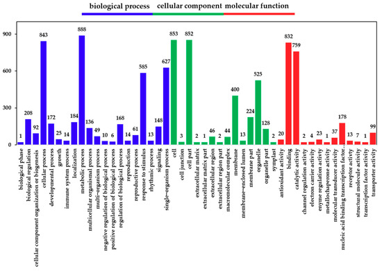 Gene ontology (GO) classification of DEGs. The x-axis represents the GO term. The y-axis represents the number of DEGs.