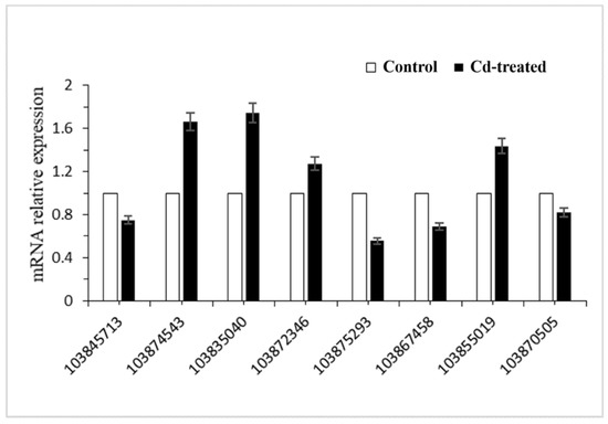 To verify the reliability of sequencing, eight differentially expressed genes were randomly selected for RT-PCR validation. Real-time PCR results showed that the transcription levels of these eight genes were consistent with the results of transcriptome sequencing (Figure 5, Table 2). Using this, we can conclude that the results of transcriptome sequencing can represent differences in transcriptome levels in the hairy roots of Brassica campestris L. caused by Cd stress. We found that the Gene ID 103874543 involved in the synthesis of glutathione was up-regulated.