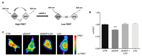 Measurements of intracellular cAMP by FRET. (A) Schematic model showing a FRET probe containing the cAMP-binding sequence of Epac1 sandwiched between ECFP (donor) and EYFP (acceptor). Binding of cAMP to the Epac1 results in an intermolecular steric conformation change causing an increase in the distance between the fluorescent donor and the acceptor, thereby decreasing the FRET process. (B) dDAVP stimulation significantly increased cAMP levels with respect to cells left untreated or in presence of lixivaptan (LXV), with or without dDAVP (*** p < 0.0001, n = 160 cells). Co-treatment with LXV prevented cAMP increase induced by dDAVP. All data were analyzed by one-way ANOVA followed by Newman–Keuls multiple comparisons test and are expressed as means ± SEM. (C) Representative transfected cells with H96 probe showing the FRET signal (ratio 535/30 nm) depicted in false color.