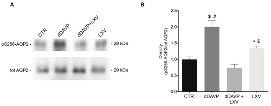 Effect of lixivaptan on pS256-AQP2 levels. (A) Equal amount of proteins from MCD4 cells were immunoblotted for evaluation of pS256-AQP2 and total AQP2 levels. (B) Statistical analysis revealed that lixivaptan prevented the increase of AQP2 phosphorylated at S256 induced by dDAVP. No alterations in pS256-AQP2 levels were observed by the sole treatment with lixivaptan. dDAVP alone induced a significant increase in pS256-AQP2 compared to cells under basal condition. Data are expressed as means ± SEM and were analyzed by one-way ANOVA followed by Newman–Keuls multiple comparisons test ($ p < 0.0001 dDAVP vs. dDAVP+LXV, # p < 0.001 dDAVP vs. CTR, £ p < 0.01 LXV vs. dDAVP, * p < 0.05 LXV vs. dDAVP+LXV, n.s. CTR vs. dDAVP+LXV or LXV; n = 5).