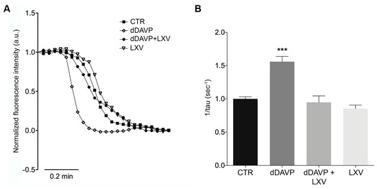 Effect of lixivaptan on osmotic water permeability. (A) Representative normalized traces of the time course of alterations in the osmotic water permeability in response to exposure to a hyperosmotic solution, followed as modulation of normalized calcein fluorescence intensity. Osmotic permeability measurements studies in MCD4 cells expressing human V2R and AQP2 were performed as described in Materials and Methods. (B) The temporal osmotic response is indicated as 1/τ (s−1). Lixivaptan prevented dDAVP-induced cell swelling (*** p < 0.0001). Data were analyzed by one-way ANOVA followed by Newman–Keuls multiple comparisons test and are expressed as means ± SEM.