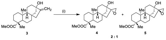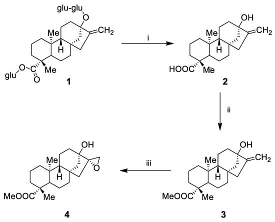 Steviol (2) was prepared starting from commercially available natural stevioside (1), the glycoside of steviol, in two steps, according to literature methods [26,35]. The esterification of 2 was accomplished with diazomethane, resulting in steviol methyl ester (3) [26]. The epoxidation of 3 with t-BuOOH in the presence of vanadyl acetylacetonate (VO(acac)2) as the catalyst furnished cis-epoxyalcohol 4 in a stereospecific reaction with known stereochemistry (Scheme 1) [32,36].