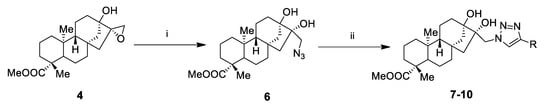 The reaction of cis-epoxyalcohol 4 with sodium azide in the presence of ammonium chloride in a mixture of EtOH/water gave azidodiol 6, from which triazoles 7–10 and 18 were generated by a “click” reaction with various substituted alkynes (Scheme 3) [38,39].