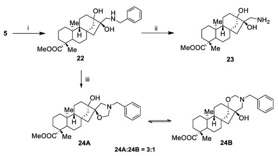 4.6.9. (4R,6aS,8R,9S,11aR,11bS)-Methyl 8-((benzylamino)methyl)-8,9-dihydroxy-4,11b-dimethyltetradecahydro-6a,9-methanocyclohepta[a]naphthalene-4-carboxylate (22)