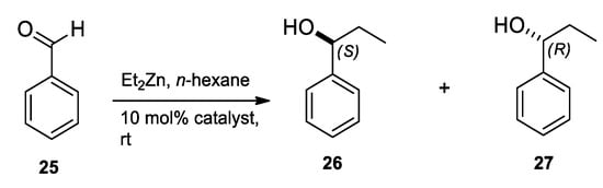 Aminodiol derivatives 7–24 were applied as chiral catalysts in the enantioselective addition of diethylzinc to benzaldehyde 25 to study their catalytic effect on the formation of (S)- or (R)-1-phenyl-1-propanol 26 and 27 (Scheme 6).