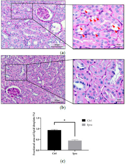 Lipid deposition in renal tubule with or without ipragliflozin. Representative images of Periodic acid-Schiff staining on kidneys paraffin-embedded 4-μm-sections from FLS-ob/ob mouse treated with (a) vehicle or (b) ipragliflozin 1 mg/kg. Magnified images from both groups were also shown. Lipid droplets could be observed in renal tubular epithelial cells (arrowheads) from the control mouse kidneys, in contrast with the sparse lipid droplets in the mice treated with ipragliflozin. These results indicated the effect of ipragliflozin on reducing lipid deposition in the renal tubules. (c) Quantification of the amount of lipid droplets. Fractional area of lipid droplets was calculated as the ratio of the total amount of lipid droplets area to the whole tissue area. The quantification is based on randomly captured three fields from six different mice in each group. Bars indicate average ± SEM. * p < 0.05 (unpaired t-test). Ctrl, control group; Ipra, ipragliflozin group.
