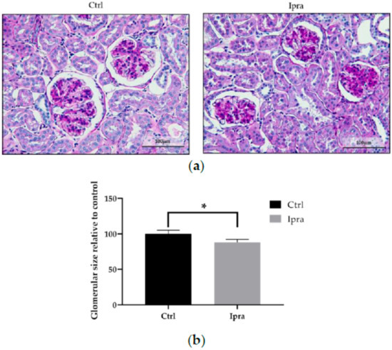 Effect of ipragliflozin on glomerular size. (a) Representative images of Periodic acid-Schiff staining on FLS-ob/ob mouse kidney paraffin-embedded sections. (b) Quantification of glomerular size. The results were expressed as the Bowman’s capsule area relative to control group. The quantification is based on at least 20 glomeruli from 6 different mice in each group. Bars indicate average ± SEM. * p < 0.05 (unpaired t-test). Ctrl, control group; Ipra, ipragliflozin group.