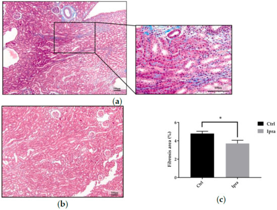 Effect of ipragliflozin on interstitial fibrosis. (a) Representative images of Masson-trichrome staining on kidney paraffin-embedded sections from FLS-ob/ob mouse in the control group with a high magnification image. (b) Representative image of Masson-trichrome staining on kidney paraffin-embedded sections from FLS-ob/ob mouse in the ipragliflozin group. (c) Quantification of the area of fibrosis. The results were expressed as the percentage of fibrotic area to the whole area. The quantification is based on randomly captured three fields from six different mice in each group. Bars indicate average ± SEM. * p < 0.05 (unpaired t-test). Ctrl, control group; Ipra, ipragliflozin group.