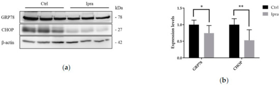 Next, we investigated whether the reduction in lipid droplets affects ER stress in the kidney. The gene expression level of glucose-regulated protein-78 (GRP78), a master regulator of ER stress response, significantly decreased in mice treated with ipragliflozin. The protein expression of GRP78 also decreased in the ipragliflozin group (Figure 4 and Figure 5). Although the mRNA levels of the downstream cascade of GRP78, including protein kinase RNA-activated-like ER kinase (PERK), eukaryotic initiation factor 2α (eIF2α), inositol requiring enzyme 1α (IRE1α), and activating transcription factor 6 (ATF6), did not show significant difference between groups (Figure 4), the other ER stress-associated proteins, including C/EBP homologous protein (CHOP), expression was significantly lower in mice treated with ipragliflozin (Figure 5).