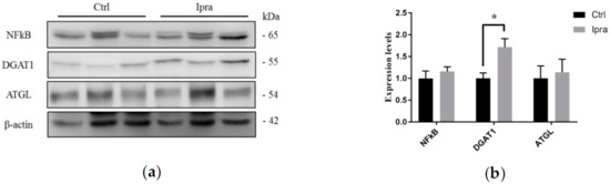 We further explored possible mechanisms underlying the protective effect of ipragliflozin on the induction of ER stress. The mRNA and protein levels of nuclear factor kappa B (NFkB), which plays an important role in the induction of ER stress, did not change after the treatment (Figure 4 and Figure 6). Since we observed a decrease in lipid deposition, we also investigated several proteins involved in lipid accumulation and droplet formation. The expression of diacylglycerol O-acyltransferase (DGAT) 1 was significantly increased in mice treated with ipragliflozin (Figure 6); however, the expression of adipose triglyceride lipase (ATGL) did not change after the treatment.