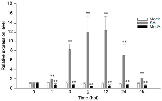 Expression levels of VaRGA1 in V. amurensis “Shuanghong” following salicylic acid (SA) and methyl jasmonate (MeJA) treatments. The expression level of VaRGA1 in “Shuanghong” under non-stressed conditions was defined as 1.0. Data represent mean values ± SD from three independent experiments. Asterisks show statistically significant difference (** p < 0.01, Student’s t test).