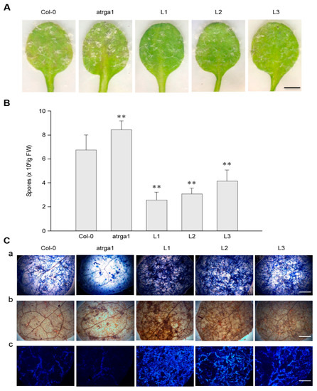 VaRGA1 expression in Arabidopsis improves resistance to Hpa. Transgenic plants (L1, L2, L3), mutants (atrga1), and non-transgenic controls (Col-0) were inoculated with Hpa for the following experiments. (A) The symptom of plants infected with Hpa seven days post-inoculation (dpi). Scale bars = 1 mm. (B) Biological statistics on the number of spores per gram were assessed at 5 dpi. Data represent mean values ± SD from three independent experiments. Asterisks show a statistically significant difference (** p < 0.01, Student’s t test). (C) Histochemical staining was performed to detect cell death, H2O2 accumulation, and O2− accumulation at 5 dpi with (a) trypan blue, (b) diaminobenzidine (DAB), and (c) Nitro blue tetrazolium (NBT) staining, respectively. Three independent experiments were conducted with 10 leaves in each. Scale bars = 0.5 mm.
