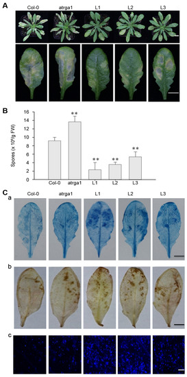 VaRGA1 expression in Arabidopsis improves resistance to PstDC3000. Transgenic plants (L1, L2, L3), mutants (atrga1), and non-transgenic controls (Col-0) were inoculated with PstDC3000 for the following experiments. (A) The symptom of plants infected with PstDC3000 5 dpi. The first scale bars = 20 mm. The second scale bars = 10 mm (B) Biological statistics on the number of spores per gram was carried out 2 dpi. Data represent mean values ± SD from three independent experiments. Asterisks show statistically significant difference (** p < 0.01, Student’s t test). (C) Histochemical staining was carried out for the detection of cell death, H2O2 accumulation, and superoxide anions (O2−) accumulation 3 dpi for (a) trypan blue, (b) diaminobenzidine (DAB), and (c) nitro blue tetrazolium (NBT) staining, respectively. Three independent experiments were conducted with 10 leaves per experiment. The black scale bars = 10 mm. The white scale bars = 0.5 mm.