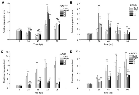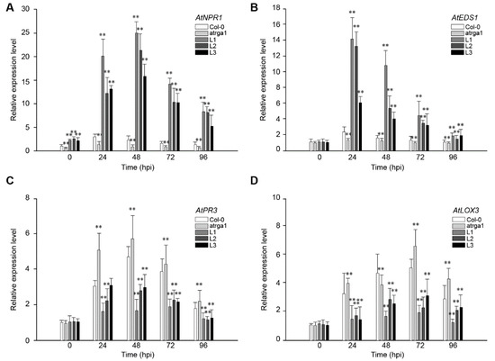 Assessment of the expression of defense-related genes at different time points after inoculating PstDC3000. Relative expression levels of (A) AtNPR1; (B) AtEDS1; (C) AtPR3, and (D) LOX3 were detected via qRT-PCR. Data represent mean values ± SD from three independent experiments. Asterisks show the statistically significant difference (** p < 0.01, Student’s t test).