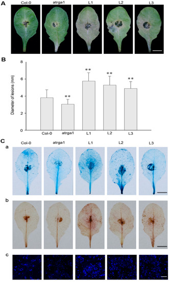 VaRGA1 expression in Arabidopsis decreases resistance to B. cinerea. Transgenic plants (L1, L2, L3), mutants (atrga1), and non-transgenic controls (Col-0) were inoculated with B. cinerea for the following experiments. (A) Symptoms of plants infected with B. cinerea 3 dpi. Scale bars = 10 mm (B) Biological statistics on lesion diameters were assessed at 3 dpi. Data represent mean values ± SD from three independent experiments. Asterisks show statistically significant differences (** p < 0.01, Student’s t test). (C) Histochemical staining was performed to detect cell death, H2O2 accumulation, and superoxide anions (O2−) accumulation at 3 dpi with (a) trypan blue, (b) diaminobenzidine (DAB), and (c) Nitro blue tetrazolium (NBT), respectively. Three independent experiments were conducted with 10 leaves in each. The black scale bars = 10 mm. The white scale bars = 0.5 mm.