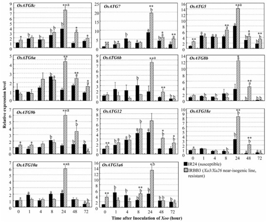 Figure 2. Autophagy-related gene (ATG) expression level in Xa3/Xa26-mediated resistance. Expression of autophagy-related genes analyzed by qRT-PCR in resistant (IRBB3) and susceptible (IR24) rice plants. Rice plants were inoculated with Xoo strain PXO61 at tilling stage. Data are presented as mean (three replicates) + standard deviation (SD). Letters “a” and “b” indicate statistically significant differences between 0 h and other time at p < 0.01 and p < 0.05, respectively in same rice plants. Double asterisks (**p < 0.01) and single asterisk (*p < 0.05) indicate different levels of statistical significance between IRBB3 and IR24 inoculated at the same time point.