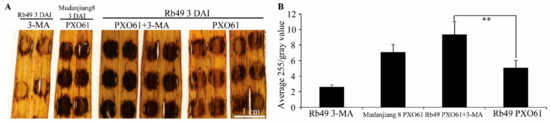 The H2O2 specifically catalyzes 3, 3′-diaminobenzidine (DAB) to polymerize into brown polymer, which is stable in most solvents [36]. The brown precipitates of DAB polymer exhibited different color intensities on the inoculation sites on the resistant Rb49 and susceptible Mudanjiang 8 plant leaves infiltrated with different solutions (Figure 4). Brown precipitates on inoculation sites of Rb49 leaves infiltrated with Xoo strain PXO61 in 3-MA solution exhibited a higher color intensity than those in H2O solution, while they showed similar color intensity to those of the Mudanjiang 8 leaves infiltrated with PXO61 in H2O solution (Figure 4A). Low color intensity of brown precipitates was observed on the inoculation sites of Rb49 plant leaves infiltrated with only 3-MA solution (Figure 4A). The color intensity of DAB polymer precipitates was calculated as 255 divided by the gray value of each inoculation site, to represent the H2O2 content on the inoculation sites (Figure 4B). The H2O2 content of inoculation sites on Rb49 plant leaves infiltrated with PXO61 in 3-MA solution was significantly (p < 0.01) higher than that in H2O solution (Figure 4B). In the same rice leaves treated by DAB staining, the percentage of inoculation sites with water-soaked symptoms on Rb49 plant leaves infiltrated with PXO61 in 3-MA solution was remarkably higher than that of the H2O solution (Supplementary Table S1).
