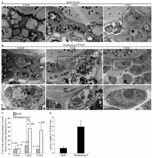Ultrastructural analysis also showed that resistant Rb49 plant and susceptible Mudanjiang 8 plant leaves inoculated with Xoo strain PXO61 exhibited different accumulation of calcium pyroantimonate precipitates (high electron-density) in xylem vessel and xylem parenchyma cells (Figure 8). In Rb49 plant leaves at 3, 5 DAI, there was a large amount of high electron-density precipitates in vacuole of xylem parenchyma cell, and no marked change of precipitates in xylem vessel was observed (Figure 8A). At 0 DAI, few precipitates were found to be accumulated in the vacuole and xylem vessel (Figure 8A). However, in Mudanjiang 8 plant leaf at 3, 5 DAI, a large number of high-electron density precipitates accumulated in the xylem vessel and on the plasma membrane of xylem parenchyma cell, and few precipitates were accumulated in vacuole of xylem parenchyma cell, or on plasma membrane, or in xylem vessel at 0 DAI (Figure 8B). Furthermore, the number of xylem parenchyma cells with calcium pyroantimonate precipitates in vacuole in Rb49 plant was 5 folds as large as the number of xylem parenchyma cells in Mudanjiang 8 plant at 3, 5 DAI (Figure 8C). Meanwhile, the number of xylem parenchyma cells with calcium pyroantimonate precipitates on plasma membrane in Rb49 plant was significantly (p < 0.01) smaller than that of the Mudanjiang 8 plant at 5 DAI (Figure 8D). For Mudanjiang 8 plant, the number of xylem parenchyma cells with precipitates on plasma membrane was markedly higher (p < 0.05 and p < 0.01) at 3, 5 DAI than at 0 DAI (Figure 8D). At the same time, the number of precipitates in xylem vessel of Rb49 plant was smaller than that of the Mudanjiang 8 plant at 3, 5 DAI, and the number of calcium pyroantimonate precipitates in xylem vessel of Mudanjiang 8 plant was significantly larger (p < 0.05 and p < 0.01) at 3, 5 DAI than at 0 DAI (Figure 8E). The lesion length of Mudanjiang 8 was larger than that of the Rb49 at 14 DAI (Figure 8F).