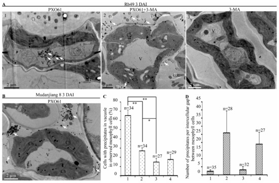 Calcium ions can specifically react with potassium pyroantimonate to form calcium pyroantimonate precipitates which show high electron-density under TEM [38]. To examine the effect of autophagy inhibitor 3-MA on calcium ion distribution in resistant Rb49 and susceptible Mudanjiang 8 plants inoculated with Xoo strain PXO61, we analyzed the cytochemical localization of the calcium ion in rice leaves by calcium pyroantimonate precipitate method (Figure 7). At 3 DAI, calcium pyroantimonate precipitates were mainly accumulated in vacuole of mesophyll cell of Rb49 leaves infiltrated with PXO61 in H2O solution (Figure 7A-1), while the calcium pyroantimonate precipitates were mostly accumulated in the intercellular gaps of mesophyll cells of Rb49 leaves infiltrated with PXO61 in 3-MA solution (Figure 7A-2). However, little calcium pyroantimonate precipitates were accumulated in vacuole and intercellular gaps of mesophyll cells of Rb49 leaves infiltrated with only 3-MA solution (Figure 7A-3). Meanwhile, there were a large number of calcium pyroantimonate precipitates in the intercellular gaps of mesophyll cell and few precipitates in vacuole of mesophyll cell of Mudanjiang 8 plant leaves infiltrated with PXO61 in H2O solution at 3 DAI (Figure 7B-4). The number of mesophyll cells with calcium pyroantimonate precipitates in vacuole of Rb49 plant leaves infiltrated with PXO61 in H2O solution was significantly (p < 0.01) larger than the number of mesophyll cells treated in 3-MA solution (Figure 7C). It was also larger than the number of mesophyll cells infiltrated with only 3-MA solution and the number of mesophyll cells in Mudanjiang 8 plant infiltrated with PXO61 in H2O solution (Figure 7C). At the same time, the numbers of calcium pyroantimonate precipitates in the intercellular gaps between mesophyll cells of Rb49 plant leaves infiltrated with PXO61 in 3-MA solution and of Mudanjiang 8 plant leaves infiltrated with PXO61 in H2O solution were larger than that of the Rb49 plant leaves infiltrated with PXO61 in H2O solution or only 3-MA solution (Figure 7D). The number of inoculation sites with water-soaked symptoms in Rb49 plant leaves infiltrated with PXO61 in 3-MA solution was higher than that of Rb49 plant leaves infiltrated with PXO61 in H2O solution (Supplementary Table S2).