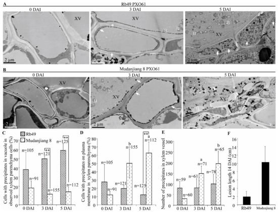 Figure 8. Calcium ion accumulation induced by Xa3/Xa26 in vacuole of xylem parenchyma cell. XV, xylem vessel; B, Xoo bacterium; white arrow and black arrow, high-electron density calcium precipitates. (A) Numerous high-electron density calcium precipitates (indicated by white arrow) in vacuole of xylem parenchyma cells in Rb49 plant leaves after inoculation by Xoo strain PXO61 at 3, 5 DAI, in comparison with 0 DAI. (B) The gradually increasing calcium precipitates (indicated by white arrow and black arrow) on plasma membrane of xylem parenchyma cell and xylem vessel lumen in Mudanjiang 8 plant leaves at 3, 5 DAI in contrast to 0 DAI. (C,D,E) Percentage of cells with calcium precipitates in vacuole (C) or on plasma membrane (D) of xylem parenchyma cells in all the observed cells, and the number of calcium precipitates in xylem vessel (E). Data represent the mean (91–155 xylem parenchyma cell of three xylem veins and 59–78 calcium precipitates of three xylem vessels from three different plants) + standard deviation (SD); n, the number of all the observed xylem parenchyma cells and the number of all the observed calcium precipitates in xylem vessels. Double asterisks (** p < 0.01) indicate statistically significant differences between Rb49 and Mudanjiang 8 at same inoculation time. The letters “a” and “b” indicate statistically significant differences between 0 day and 3, 5 day in the same rice plant at p < 0.01 and p < 0.05, respectively. (F) Lesion length of Rb49 and Mudanjiang 8 leaves infected by Xoo at 14 DAI. Each bar represents mean (10–20 leaves from four plants) + SD.