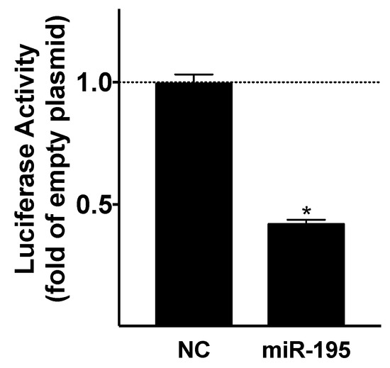 Identification of miR-195 as negative regulator of SMAD7. Luciferase activity was measured 48 h after transfection, and the values are shown as fold change of the luciferase activity with respect to the empty plasmid; cel-miR-39 mimic was used a negative control (NC). Mean ± S.E.M. of at least three independent experiments; * p < 0.05 vs. NC.