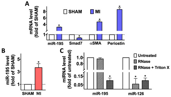Then, we moved to an in vivo setting, using an established murine model of MI, achieved via permanent occlusion of the left anterior descending coronary artery [34]; myocardial infarction was confirmed by measuring Troponin I levels in serum 1 day after surgery (MI: 60.8 ± 13.2 ng/mL vs. SHAM: 1.9 ± 0.6 ng/mL; p < 0.001) as well as by echocardiography, assessed before euthanizing the mice in terms of left ventricular ejection fraction (MI: 42.3 ± 5.7% vs. SHAM: 78.1 ± 2.7%; p < 0.01 and left ventricular fractional shortening (MI: 22.8 ± 1.5 ng/mL vs. SHAM: 50.6 ± 1.9%; p < 0.01). We demonstrated via quantitative real time PCR (RT-qPCR) that miR-195 is upregulated in fibroblasts post-ischemia (Figure 2A) and is also contained in cardiosomes (Figure 2B). To ensure that this miRNA was actually confined inside cardiosomes, the samples were treated with RNase, showing that the level of miRNAs was not affected by RNase treatment, unless in presence of Triton X-100 (Figure 2C). The activation of myofibroblasts was confirmed by the increased expression of αSMA and periostin (Figure 2A).