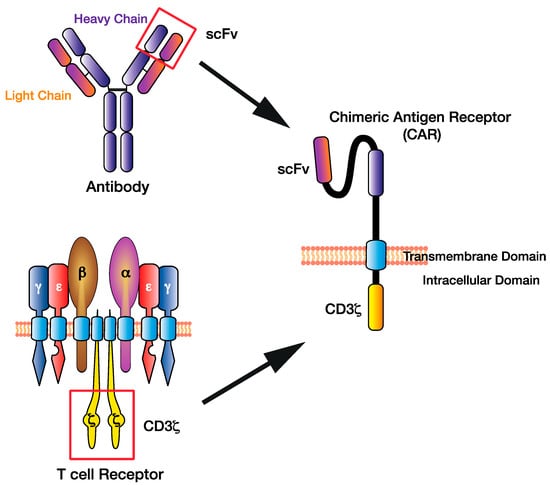 - Gross, G.; Waks, T.; Eshhar, Z. Expression of immunoglobulin-T-cell receptor chimeric molecules as functional receptors with antibody-type specificity. Proc. Natl. Acad. Sci. USA 1989, 86, 10024–10028. [Google Scholar] [CrossRef]