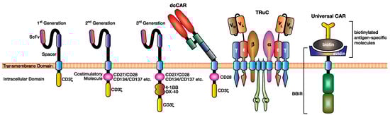 immunotherapy; chimeric antigen receptor T cells (CAR T cells); affinity tuning; dual chain CAR T cells (dcCAR); ligand-based CAR T cells; T cell receptor fusion constructs (TRuCs); universal immune receptors (UIR); dual CAR T cells; tandem CARs (tanCARs); bispecific T cell engagers (BiTEs) 1. Introduction