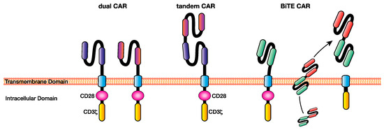 In a variation to the dual CAR concept, the tandem CAR (or tanCAR) developed by Grada and colleagues involves the engineering two scFvs as an ectodomain, separated by a Gly-Ser linker, which enables simultaneous targeting of two antigens from a single receptor [82] (Figure 3).