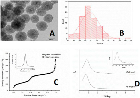 The PXRD performed in low angles confirmed the periodicity of the mesoporous material produced. It is important to notice the formation of the sharp peak in S0-1 and in the calcined sample S0-2. The analysis performed in a high angle showed the condensation of silanol groups during the calcination process as the formation of magnetic core within the structure (inset in Figure 1). The mesoporous structure of S0-2 magnetic core MSNs was also analyzed by transmission electron microscopy and the size of the primary nanoparticles was determined by image analysis (58.9 ± 8.1 nm, n = 100). The data was represented in a histogram, which shows the particle size distribution of the S0-2 nanoparticles (Figure 1C). Finally, the N2 adsorption-desorption analysis confirmed the mesoporous material formation, showing a surface area of 872 m2/g, with a pore volume of 0.85 cm3/g and a pore diameter of 3.15 nm.