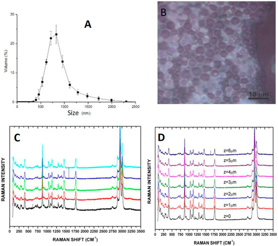 The polylactic acid polymeric nanoparticles presented a mean size of 929.47 ± 37.72 nm, with a polydispersity index (PDI) of 0.228 ± 0.05 showing homogeneous size for the nanoparticles (Figure 2). The system showed a very low PDI, which indicates that this big nanoparticles also have a monodisperse behavior. The Raman spectroscopy analysis corroborated the spherical shape and composition of the microparticles.