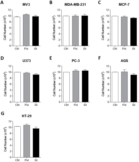Nanoparticle effects on tumor cytotoxicity. Tumor cells were incubated with polymeric or silica nanoparticles (20μg/mL) for 24 hs. Cytotoxicity was evaluated using the 3-(4,5-dimethylthiazol-2-yl)-2,5-diphenyltetrazolium bromide MTT assay. (A). MV3 (human melanoma cancer cell line) (B). MDA-MB-231 (human triple negative breast cancer cell line) (C). MCF-7 (human breast cancer cell line) (D). U373 (human glioblastoma cell line) (E). PC-3 (human prostate cancer cell line) (F). AGS (human gastric cancer cell line) (G). HT-29 (human colon cancer cell line). Results are presented as the mean ± SD calculated from three individual experiments (* p < 0.05).