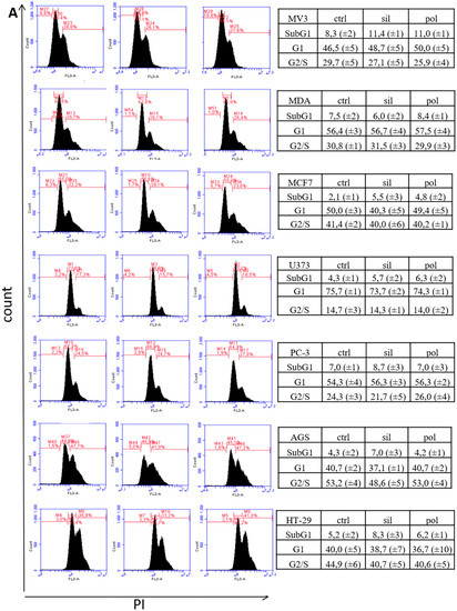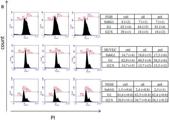 Effects of nanoparticles in the cell cycle of tumor and non-tumor cells. Tumor cells (panel A) and non-tumor cells (panel B) were incubated with polymeric (pol) or silica (sil) nanoparticles (20 μg/mL) for 24 h. Then, cells were harvest and dyed with Propidium iodide (PI) as described in methodology section. DNA content was detected by flow cytometry for the presence of cells in different stages (SubG1, G1 and S/G2) of cell cycle. Figures are representative from 3 individual experiments.