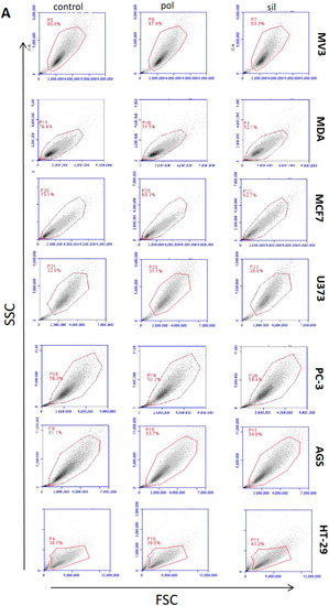 The results presented in Figure 6A,B showed that both, polylactic acid polymeric nanoparticles and MMSN, were capable to alter the granularity and size of tumor and non-tumor cells (24 post-incubation when just compared to untreated cells (controls). Is important to notice that more studies including nanoparticles-trafficking into the cells as the use of a positive control should be performed in order to deterministically establish the status and the mechanism of the morphological alteration found.